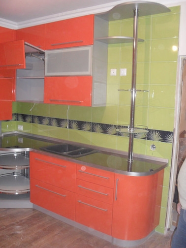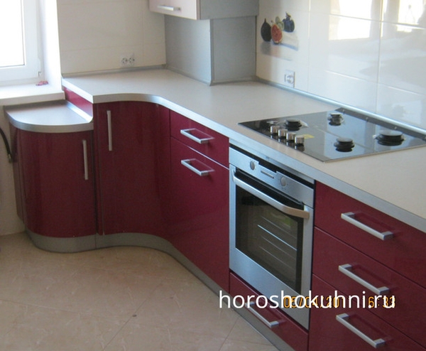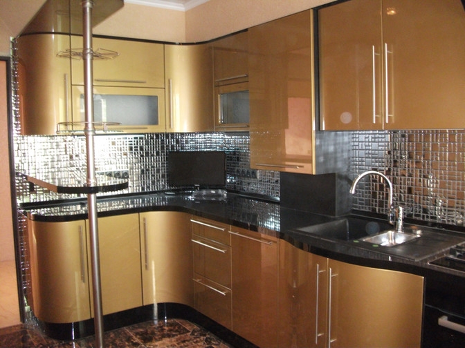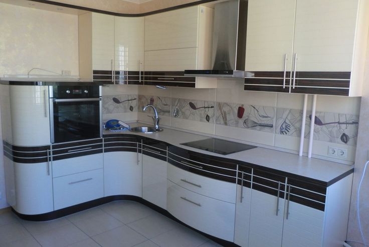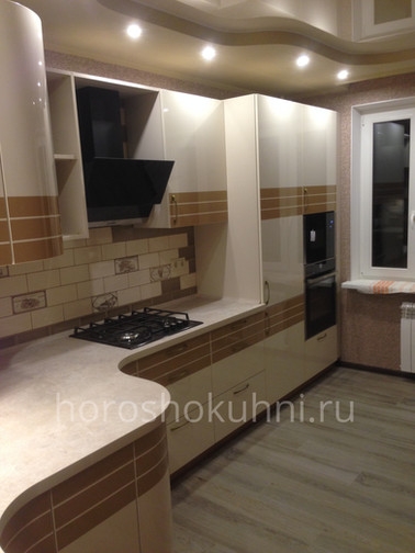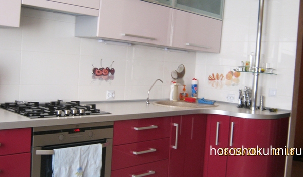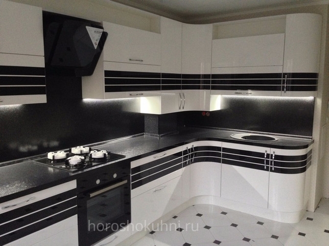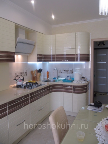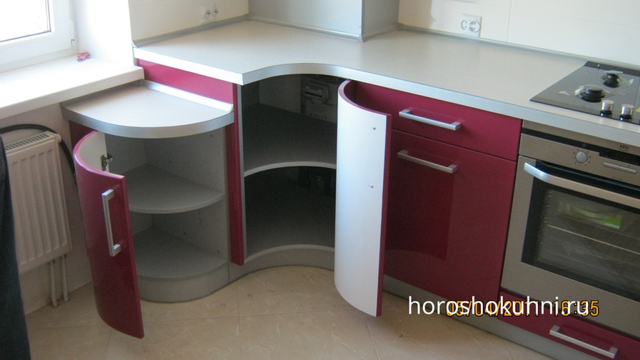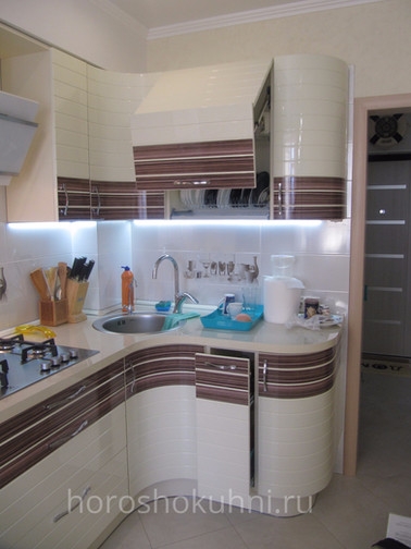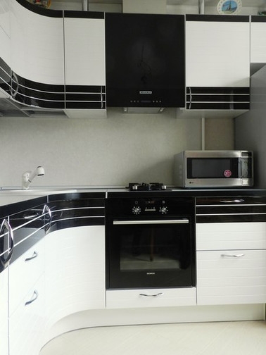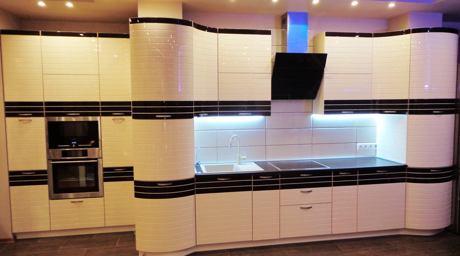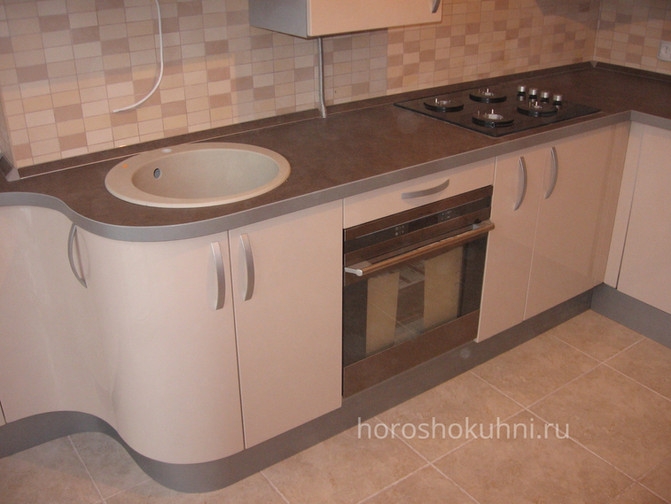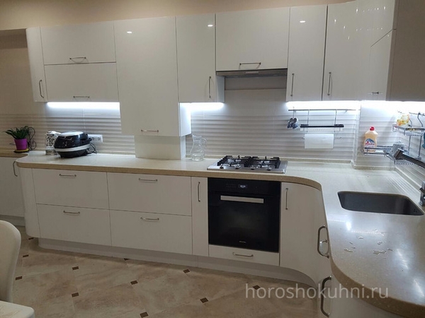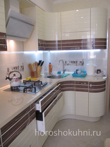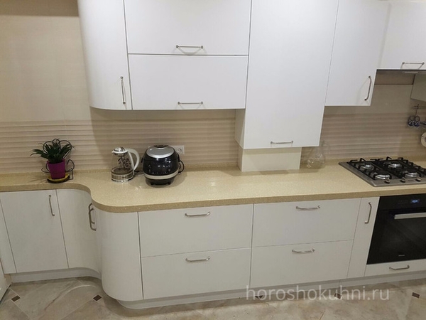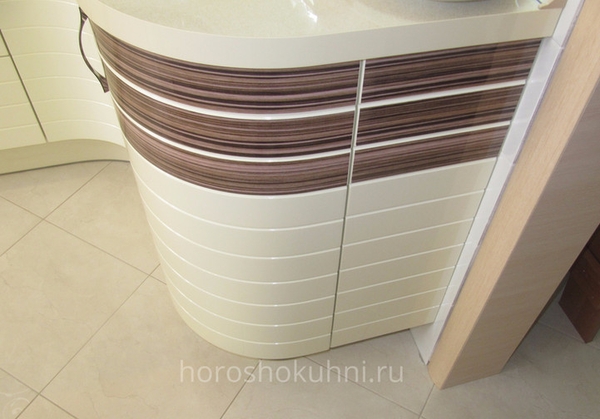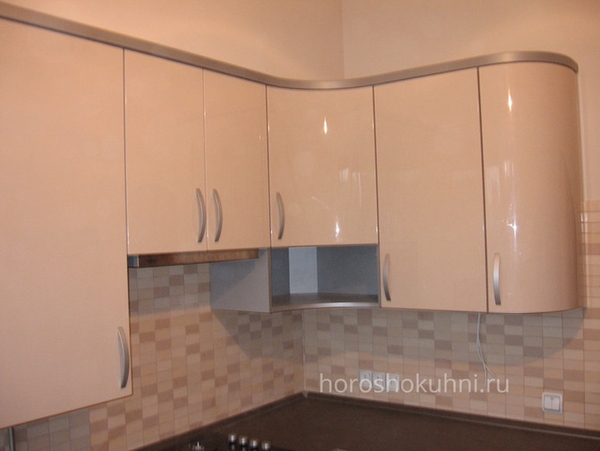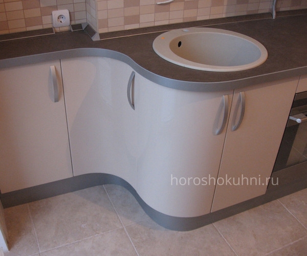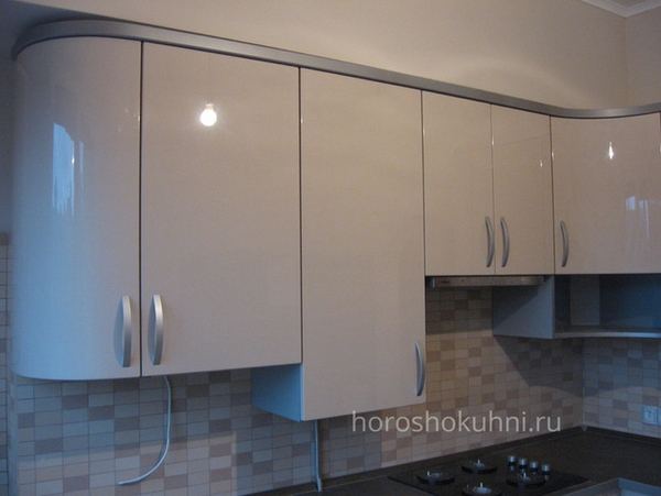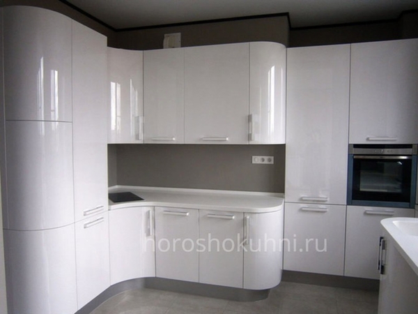 Радиусные кухни под Ваши размеры смотрятся стильно и современно – это выбор тех, кто шагает в ногу со временем. Кухня с радиусными фасадами выигрышно смотрится в помещении любых размеров. Закруглённые фасады выполняют не только эстетическую функцию, но и практическую, особенно на входе в помещение – ограничивая выступающие углы. Радиусные фасады позволяют создавать выгнутые, вогнутые и волнообразные линии кухонной мебели. Для изготовления радиусных фасадов в основном используют МДФ, покрытый краской и благодаря этому Вы имеете возможность широкого выбора по цветовому решению и заказать матовую либо глянцевую поверхность.