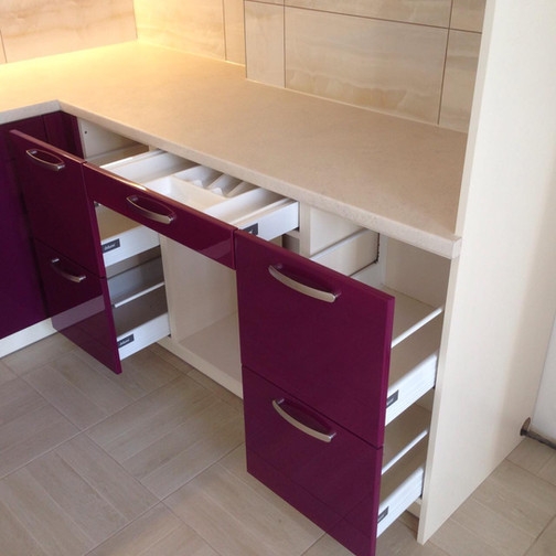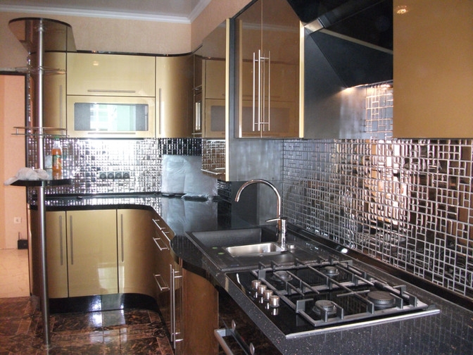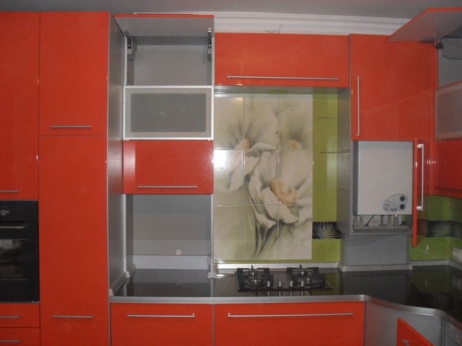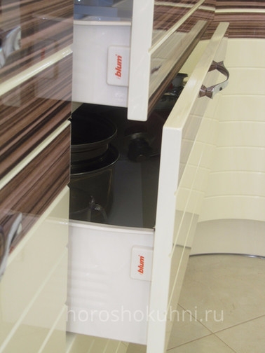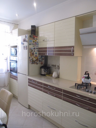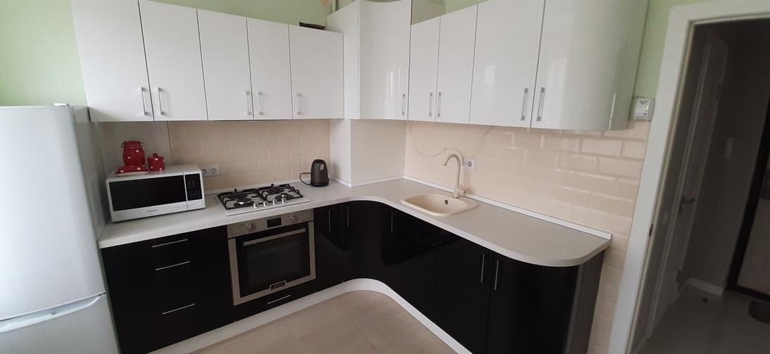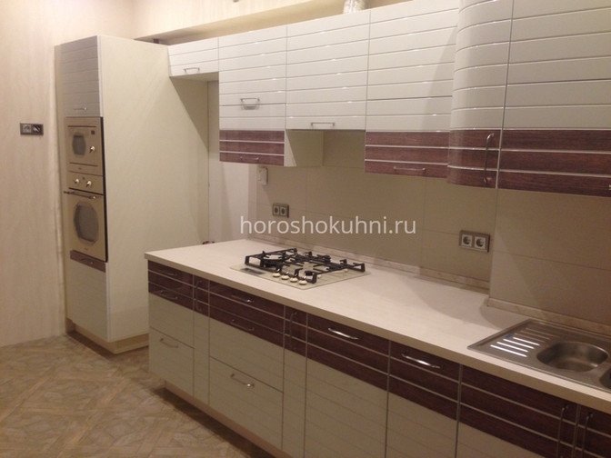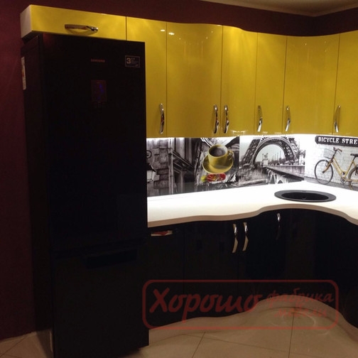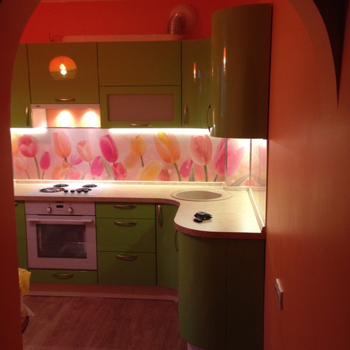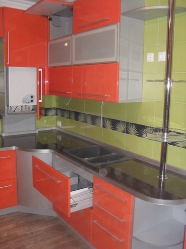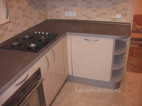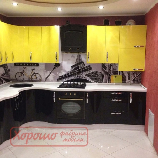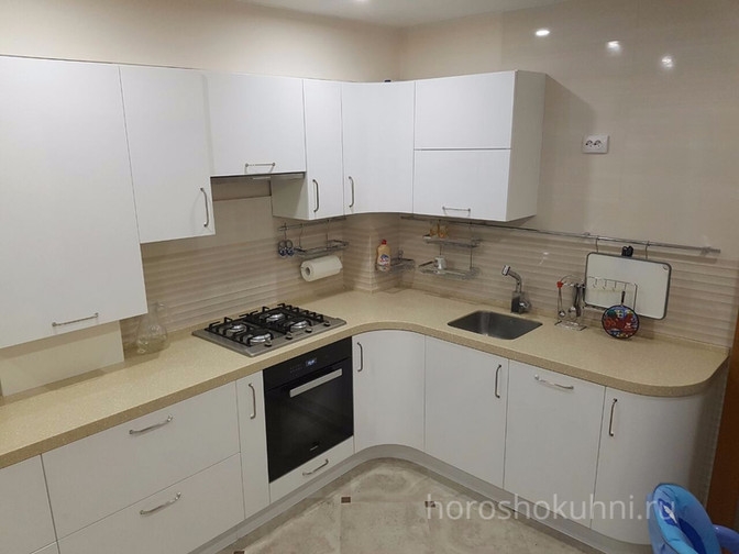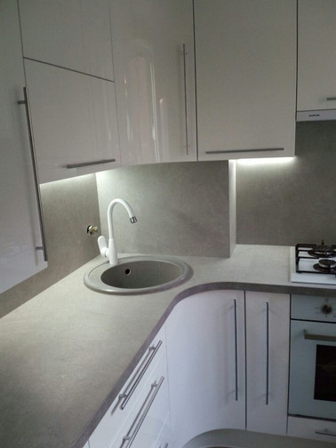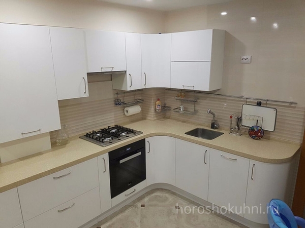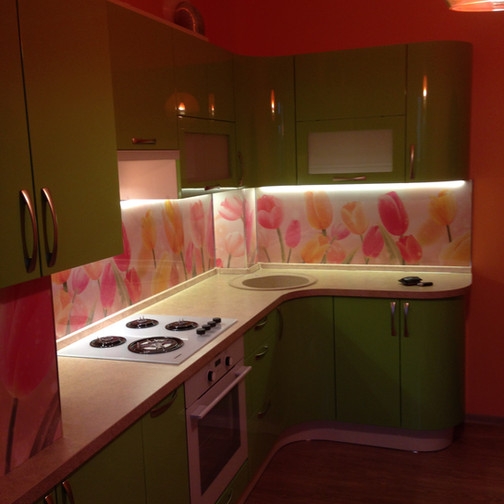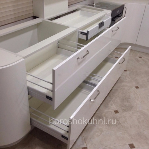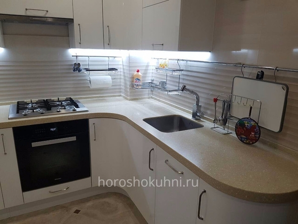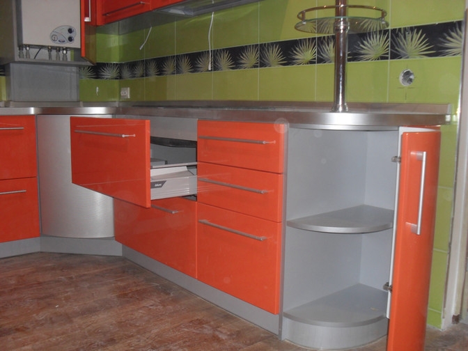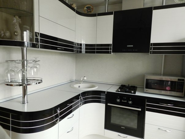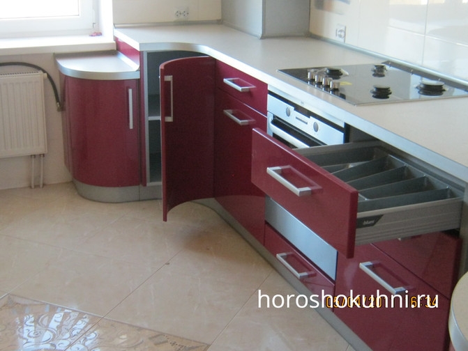 Радиусные кухни под Ваши размеры смотрятся стильно и современно – это выбор тех, кто шагает в ногу со временем. Кухня с радиусными фасадами выигрышно смотрится в помещении любых размеров. Закруглённые фасады выполняют не только эстетическую функцию, но и практическую, особенно на входе в помещение – ограничивая выступающие углы. Радиусные фасады позволяют создавать выгнутые, вогнутые и волнообразные линии кухонной мебели. Для изготовления радиусных фасадов в основном используют МДФ, покрытый краской и благодаря этому Вы имеете возможность широкого выбора по цветовому решению и заказать матовую либо глянцевую поверхность.